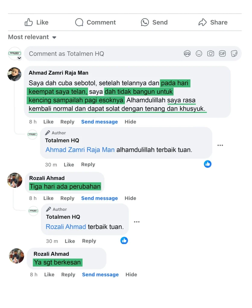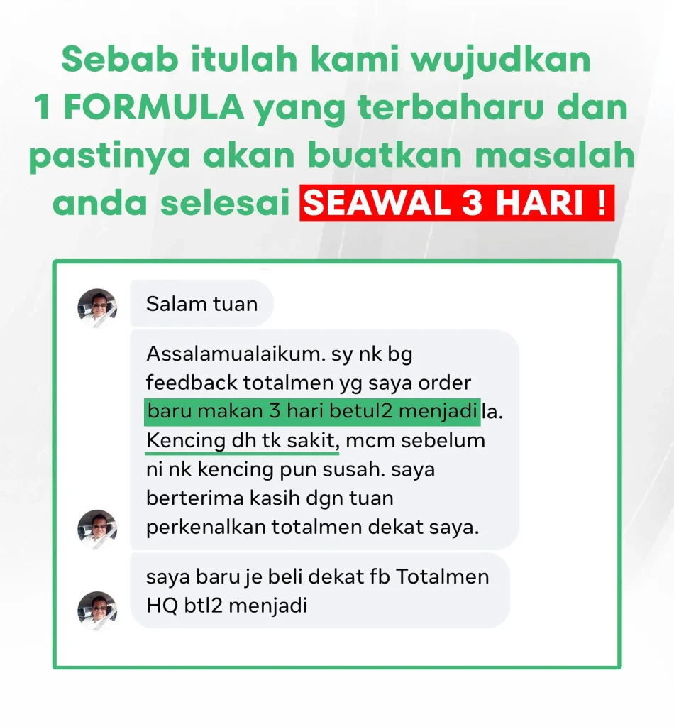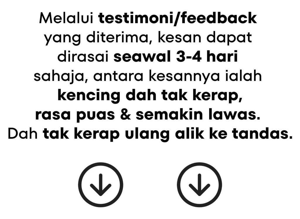 *PENAFIAN: Keberkesanan produk ini bergantung kepada kesesuaian individu. Setiap hasil dari penggunaan adalah berbeza bagi setiap individu. Produk ini akan memberi kesan terbaik sekiranya pengguna mengamalkan dengan cara betul berdasarkan banyak testimoni yang diperolehi. Kita berikhtiar, Tuhan yang menyembuhkan. Pengguna dinasihatkan menggunakan produk ini seperti arahan pada produk. Namun kami tidak bertanggungjawab jika sebarang masalah/komplikasi berlaku kepada pengguna di atas penggunaan produk ini.